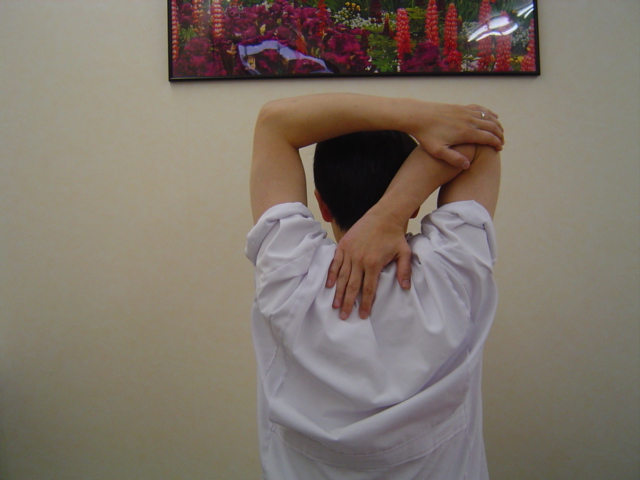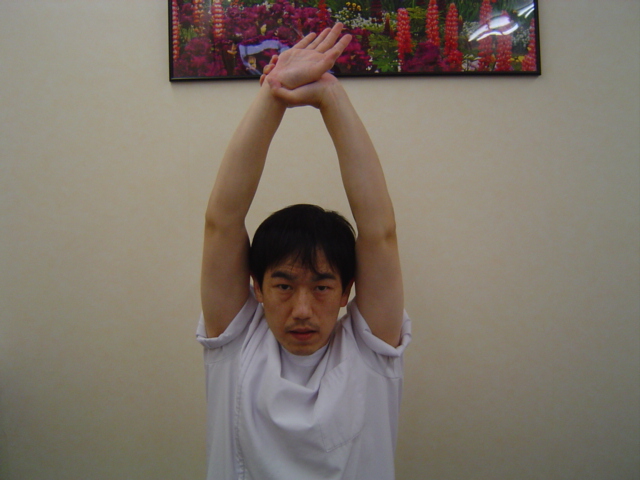両腕を上に伸ばしながら右手で左手首を持ち、 肩の筋肉を上に向かって伸ばします。伸ばした腕を後ろにそらすと、さらに効果が上がります。反対側も同様に行います。 |