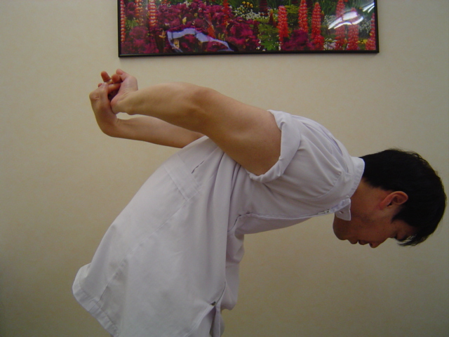 (クロスしにくい場合は、手を組み合わせるだけでもOK) そのまま前かがみになって肩の筋肉をストレッチします。手を組み替えて同様に行います。 |