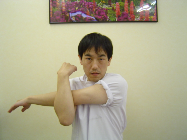 右腕を左側に向かって水平に伸ばし、左腕で右腕の ひじの上をクロスさせ、自分の体の方に引っ張ります。 腕を入れ替えて同様に行います。 |