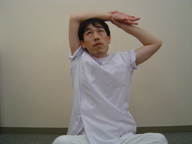 耳の横に右腕を密着させ、頭のてっぺんの上に腕を置きます。